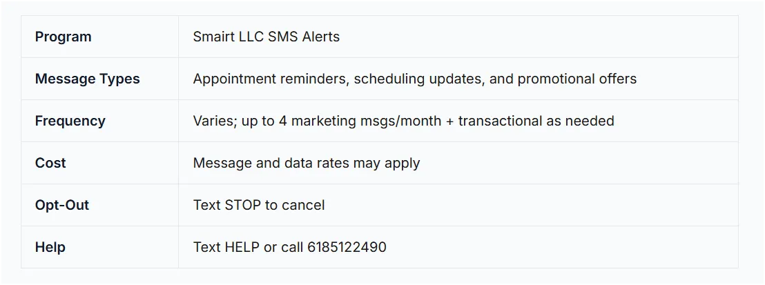 Smairt LLC ("Company," "we," "us," or "our") offers an SMS/text messaging program to provide customers with appointment reminders, scheduling updates, and promotional offers. By opting into our SMS program, you agree to receive recurring automated text messages from Smairt LLC at the mobile number you provided.